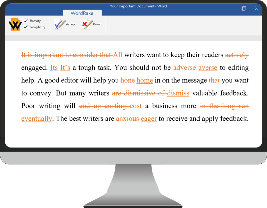 Whether you’re communicating with sophisticated clients, inquisitive readers, or the general public, WordRake works side-by-side with you and streamlines your writing so readers can focus on your message.